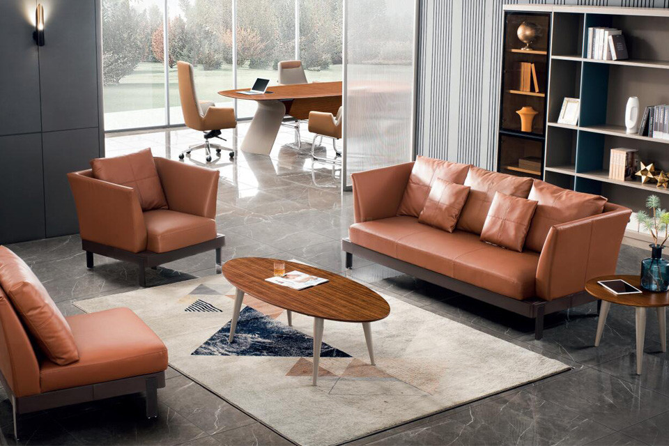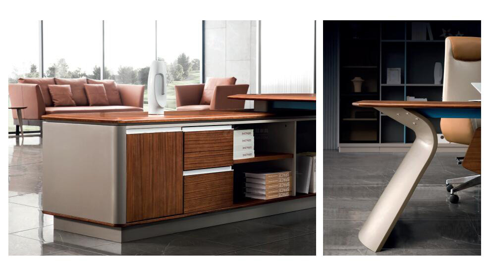 现代办公空间着重体现工作与生活的有机融合。整体巧妙的运用叠加、切割等现代设计手法,注重材质与线条比例的分隔变化,精于品质,在方寸之间尽显都市精英的格调。班台摒弃单调,借鉴建筑的块面分割,立体大气,层次感丰富,文件柜兼顾展示与收纳,结合了玻璃材质的通透性,岩板的装饰与灯光的渲染,增加空间的氛围感;柜架可根据实际需求自由搭配,既实用又人性化。